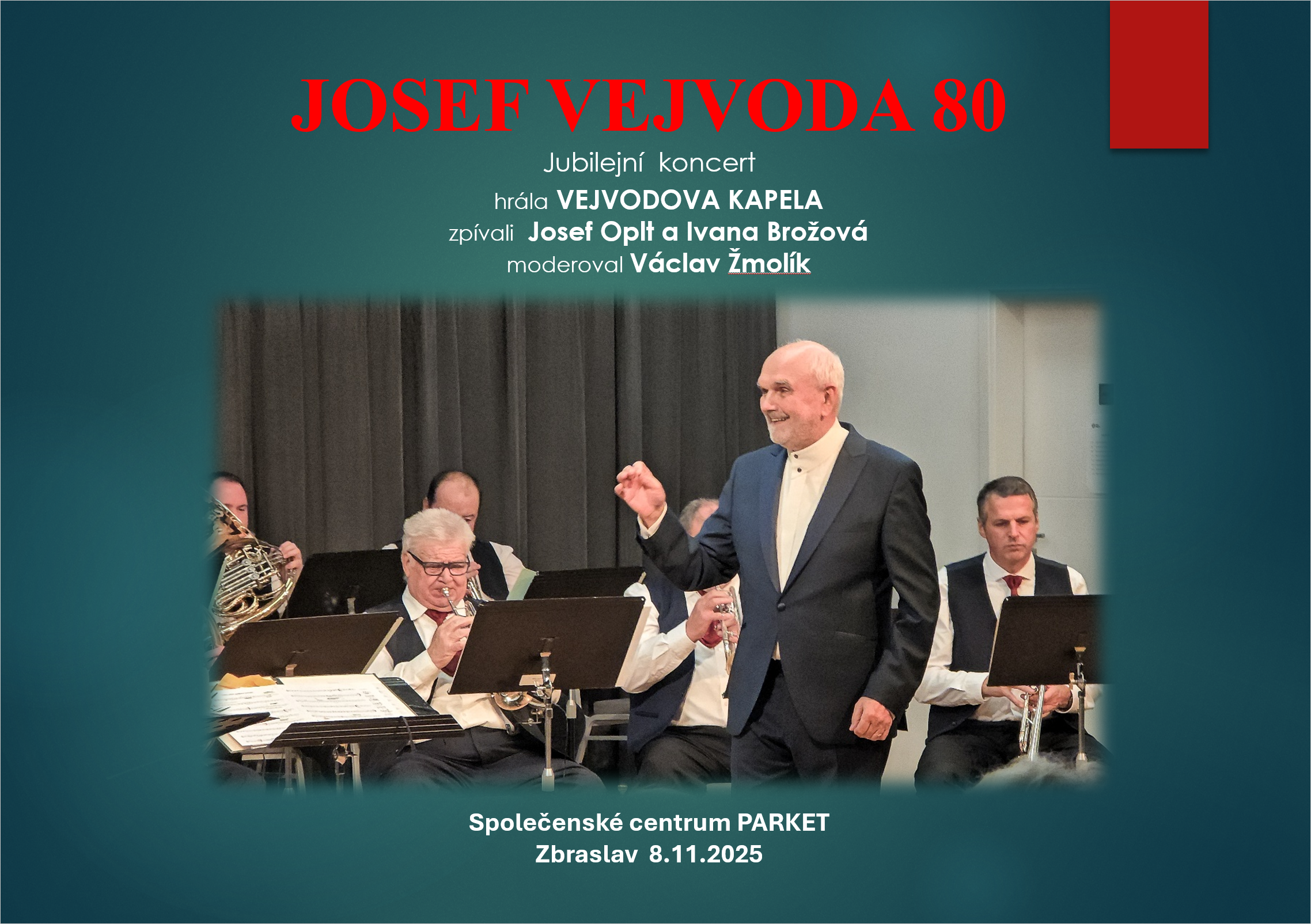 „Pár slov jedné polky Josefa Vejvody na úvod textu k jednomu krásnému koncertu. V sobotu 8. listopadu rozhodně muzikanti z Vejvodovy kapely drahoty nedělali. Vždyť hráli svému kapelníkovi k osmdesátým narozeninám! A to ve Zbraslavi, kterou Vejvodův rod proslavil. Koncertu se zúčastnili i členové a příznivci Klubu přátel Františka Kmocha, kteří přijeli autobusem z Kolína na osobní pozvání Josefa Vejvody. V krásném sále zbraslavského kulturního zařízení PARKET zněly téměř dvě hodiny písničky nejen oslavence, ale i jeho tatínka, slavného Jaromíra Vejvody, skvěle interpretované Josefem Opltem a Ivankou Brožovou. Publikum, ve kterém nechyběli ani hudební osobnosti, zpívalo s nimi. Nádherný večer slovem doprovodil Václav Žmolík, jako host promluvil jeden z Vejvodových textařů, známý Miloň Čepelka. Oslavenec si to užíval, přijímal gratulace a dary a usmíval se na všechny strany. Jeho milá manželka Květuška, které věnoval i jednu ze skladeb, na všechno dohlížela a nakonec rozdávala CD, která pro své věrné Josef Vejvoda připravil. I my jsme si do Kolína odváželi hudební dárky. A hlavně krásné zážitky z koncertu. Děkujeme!!!“