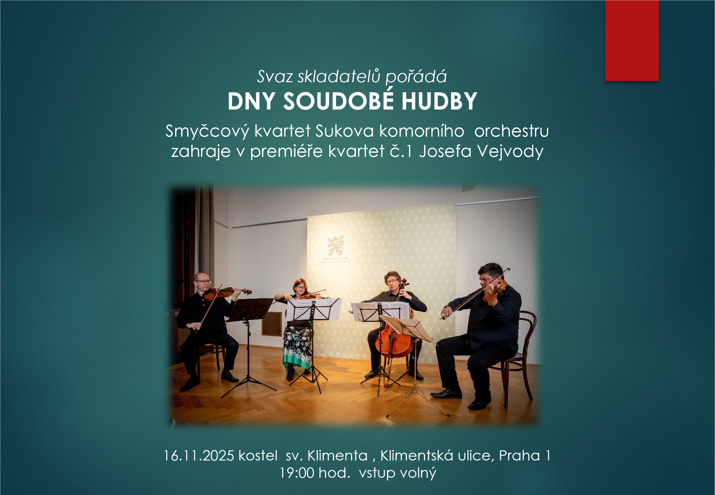 Smyčcový kvartet Sukova komorního orchestru zahrál v premiéře kvartet č.1 Josefa Vejvody.
